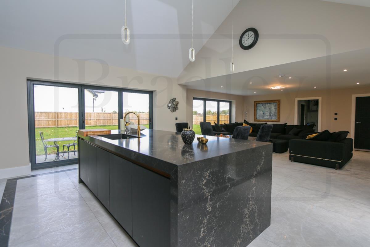 The double doors create the perfect entrance to this unique home. The vast hall opens up to the first and second floors, offering an incredible view that showcases the size and grandeur of the property. Extensive glazing floods the space with natural light. From the hall, you’ll find access to the snug, proposed cinema room, utility room, and family room. The snug offers a cosy retreat at the front of the property, while the spacious proposed cinema room is perfect for relaxing, watching a film, or enjoying a sporting event.