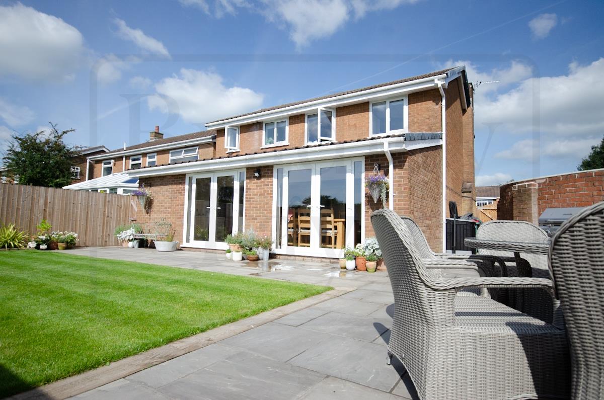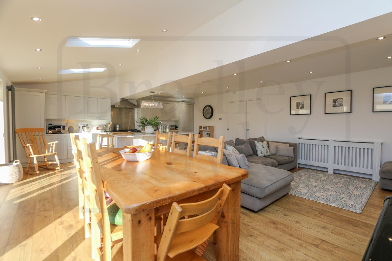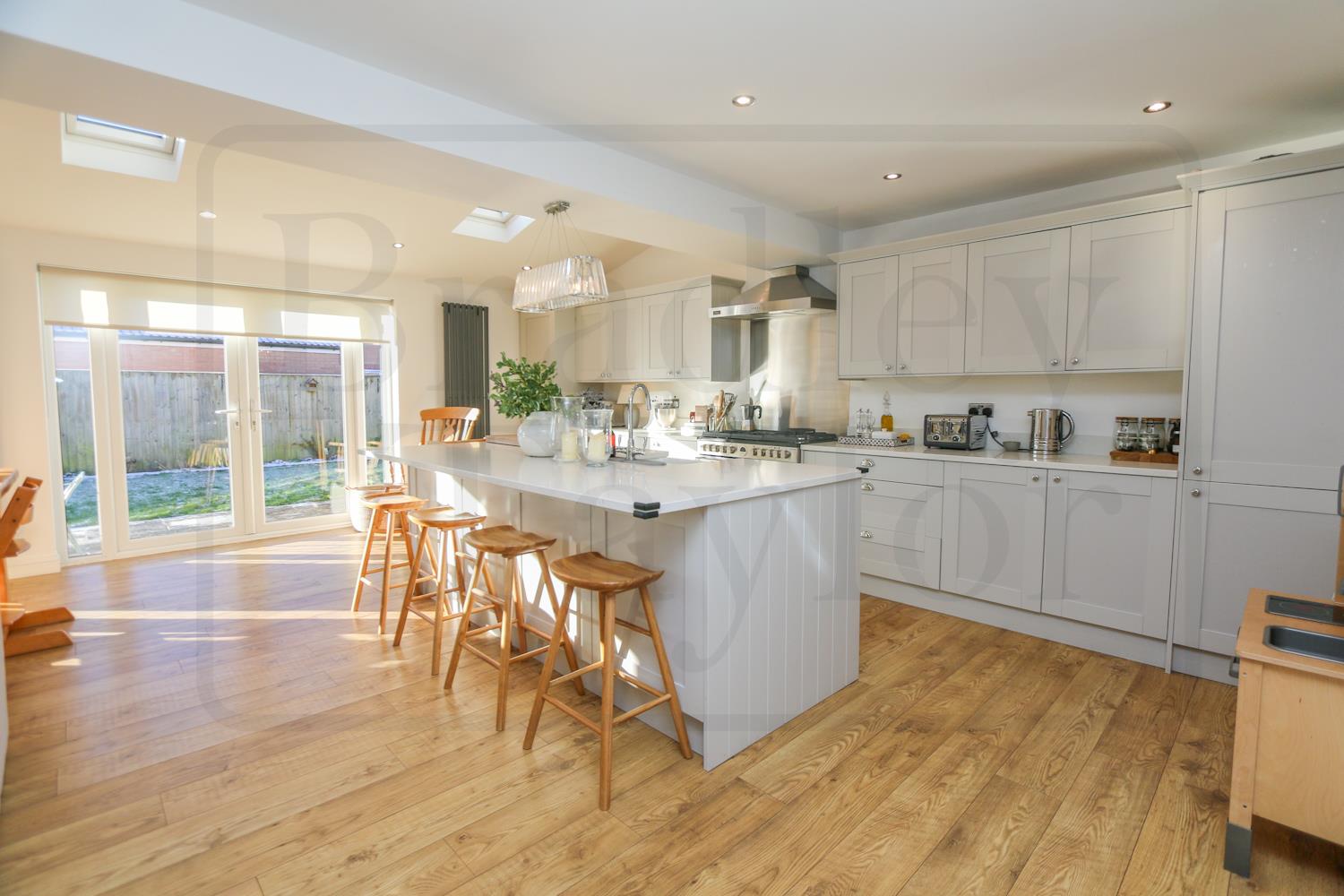 The contemporary kitchen is both practical and highly sociable, featuring generous storage, a central island and breakfast bar. Two sets of double doors open directly onto the south-facing rear garden, creating a seamless indoor-outdoor flow — ideal for family life, summer gatherings and keeping an eye on children at play.