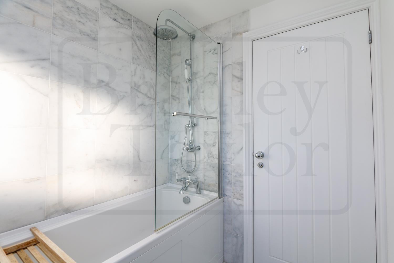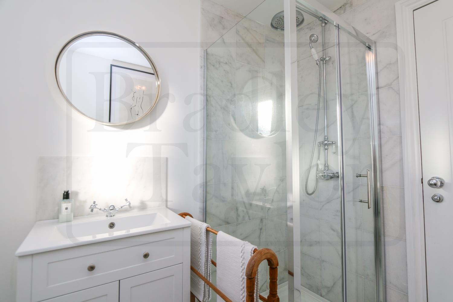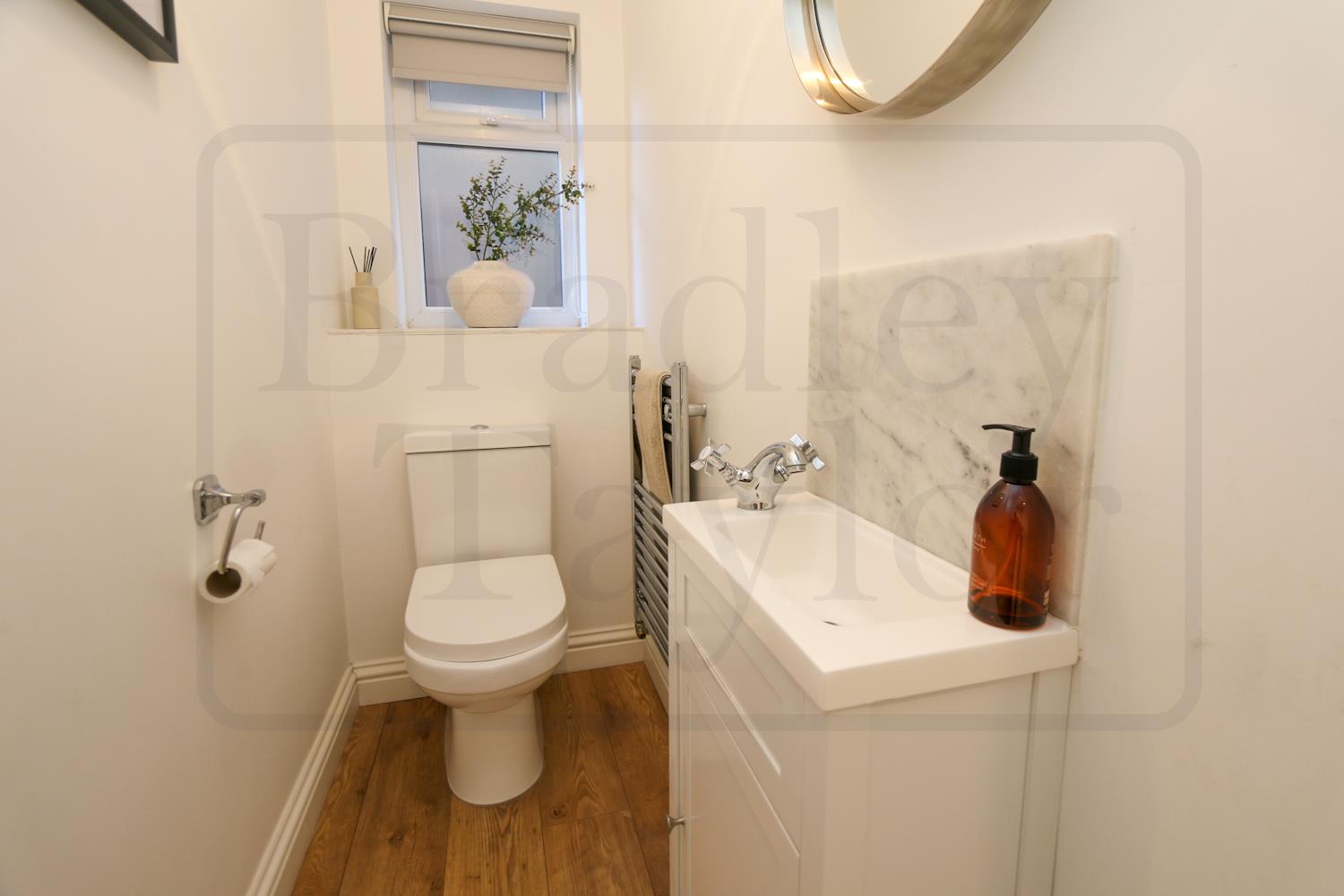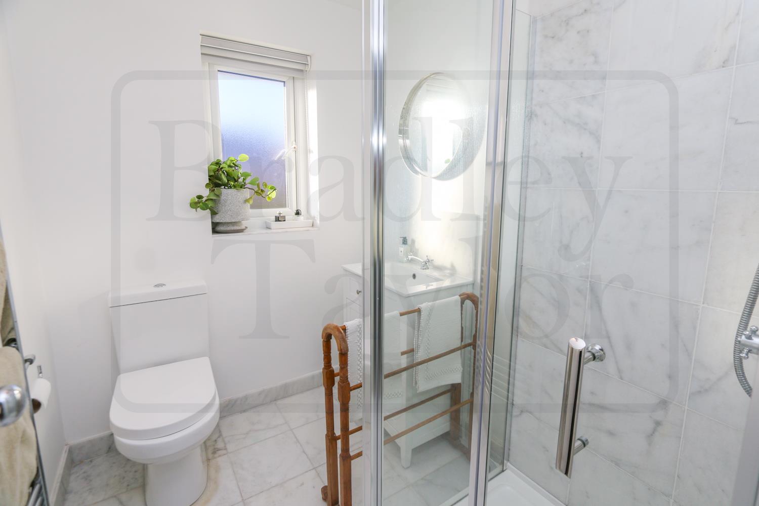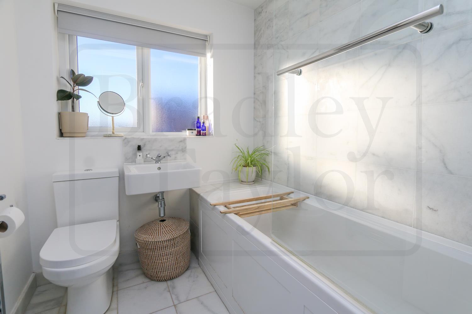 Upstairs, the property offers four well-proportioned bedrooms, including a spacious principal bedroom with fitted wardrobes and a sleek en-suite. A modern three-piece family bathroom completes the first floor, with both bathrooms finished to a high standard and enhanced by elegant white marble tiling.
